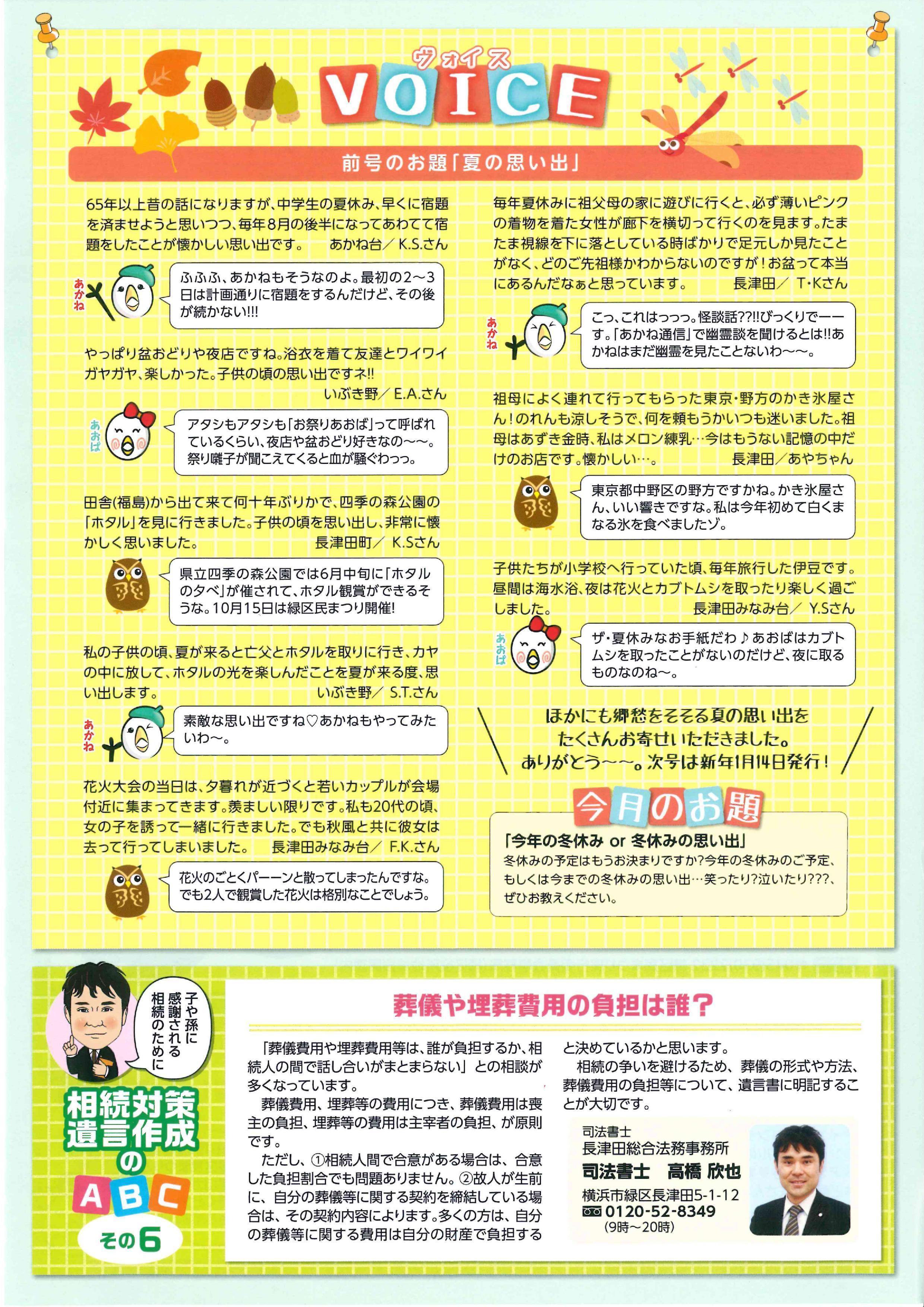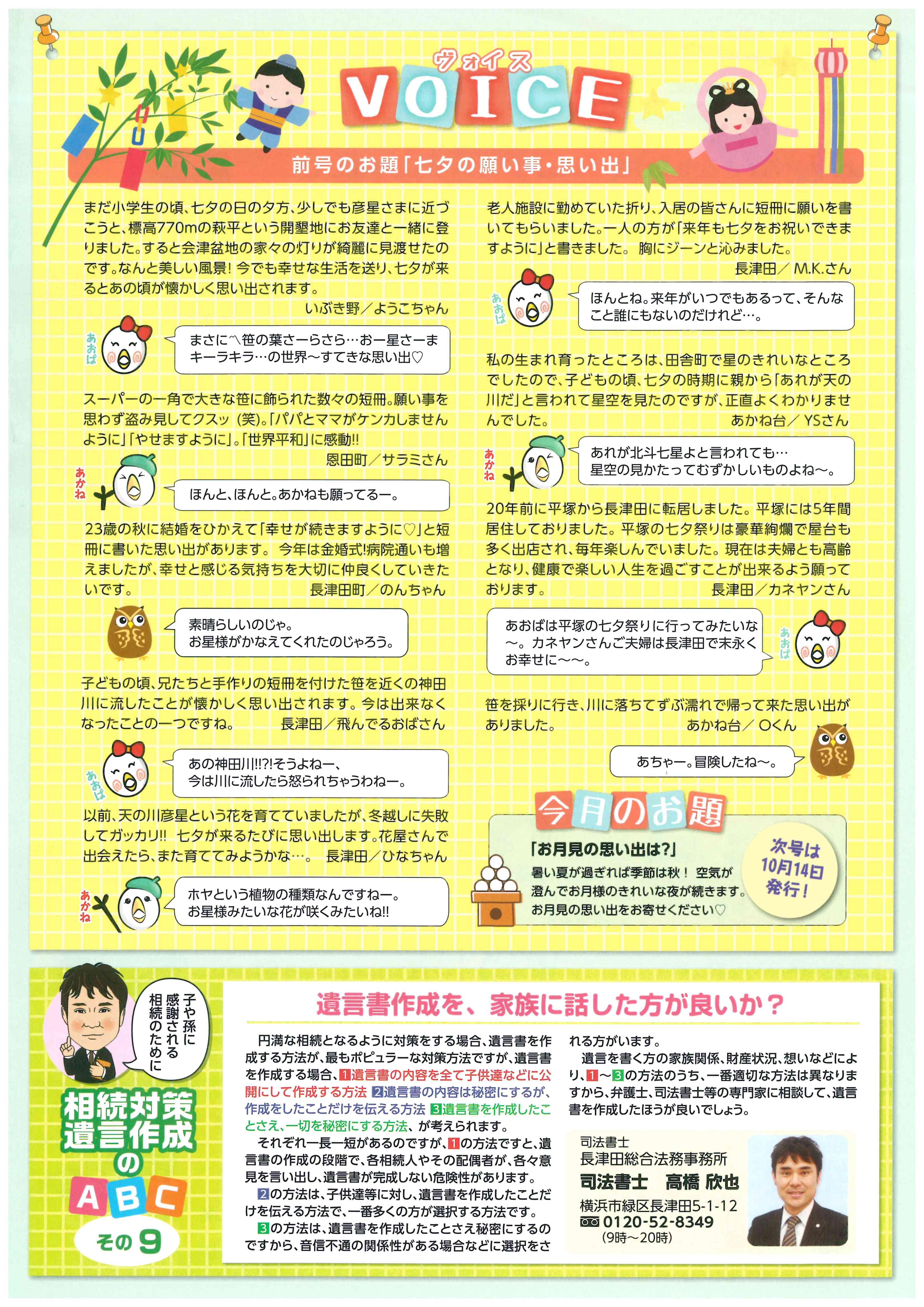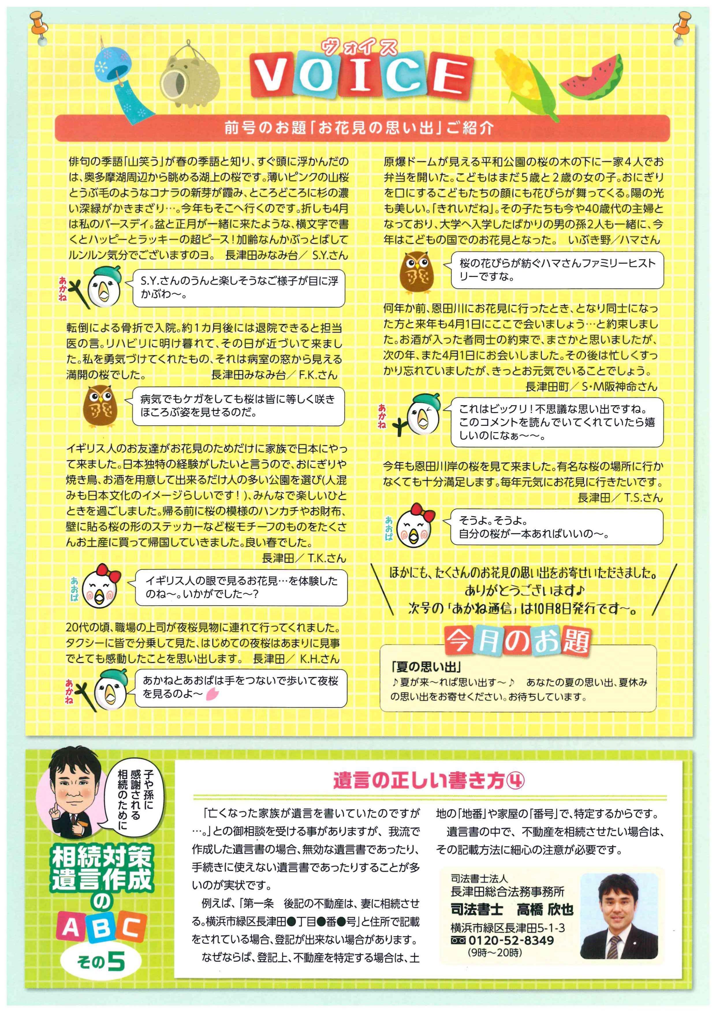 1月・4月・7月・10月 発行! (相続や遺言についての為になるコラム記事!) ▼2018年10月号(掲載その10)▼ ▼2018年7月号(掲載その9)▼ ▼2018年4月号(掲載その8)▼ ▼2018年1月号(掲載その7)▼ ▼2017年10月号(掲載その6)▼ ▼2017年7月号(掲載その5)▼ ▼2017年7月号(掲載その4)▼ ▼2017年2月号(掲載その3)▼ ▼2017年1月号(掲載その2)▼ ▼2016年12月号(掲載その1)▼
