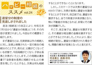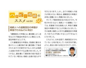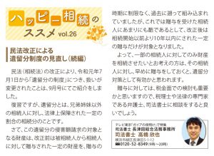 民法(相続法)の改正により、令和元年7月1日から「遺留分の制度」につき、扱いが変更されたことは、9月号にてご紹介をしました。復習ですが、遺留分とは、兄弟姉妹以外の相続人に対し、法律上保障された一定の割合の相続分のことです。