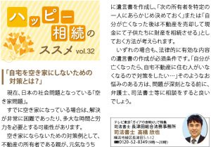 | 現在、日本の社会問題となっている「空き家問題」。 すでに空き家になっている場合は、解決が非常に困難であったり、多大な時間と労力を必要とする可能性があります。 空き家にならないための対策例として、不動産の所有者である親が、元気なうちに遺言書を作成し、「次の所有者を特定の一人にあらかじめ決めておく」または「自分が亡くなった後は不動産を売却して現金にて子供たちに財産を相続させる」としておく方法が考えられます。 いずれの場合も、法律的に有効な内容の遺言書の作成が必須条件です。「自分が亡くなったら、自宅不動産に住む人がいなくなるので対策をしたい…」そのようなお悩みのある方は、問題が深刻となる前に、弁護士、司法書士等に相談をするとよいでしょう。 |