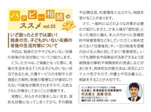 | 前回に引き続き、独身の方や子供がいない夫婦(いわゆる「おひとり様」・「おふたり様」)につき、備えておくべき対策をご紹介します。 このような方々は、亡くなった後に、通常は子供が対応をする様々な手続きや身辺整理をする人がいないため、予め、『死後の事務委任契約』を作成しておくと誰かに迷惑が及ぶことを防ぐことができます。 具体的には、葬儀や埋葬、病院や施設の解約手続き、電気ガス水道等の解約、携帯電話の解約、施設や自宅内にある遺品の処分、役所への各種届出などを行ってくれる方と、公正証書にて『死後事務委任契約』を締結しておくという方法です。 具体的に相談をしたい場合は、死後の対策に詳しく、且つ複数名の専門家が所属している司法書士事務所、弁護士事務所などに相談をすると良いでしょう。 |