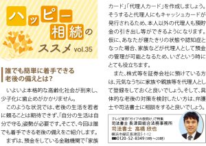 | いよいよ本格的な高齢化社会が到来し、少子化に歯止めがかかりません。 このような状況では、老後の生活を若者に頼ることは期待できず、「自分の生活は自分で守る」姿勢が必要です。そこで、今回は誰でも着手できる老後の備えをご紹介します。 まずは、預金をしている金融機関で「家族カード」「代理人カード」を作成しましょう。そうすると代理人にもキャッシュカードが発行されるため、本人以外の代理人も預貯金の引き出し等ができるようになります。仮に、あなたが寝たきりの状態や認知症となった場合、家族などが代理人として預金の管理が可能となるため、いざという時はとても役立ちます。 また、株式等を証券会社に預けている方は、元気なうちに家族や親族等を代理人として登録をしておくとよいでしょう。そして、具体的な老後の対策を検討したい方は、弁護士や司法書士に相談をするとよいでしょう。 |