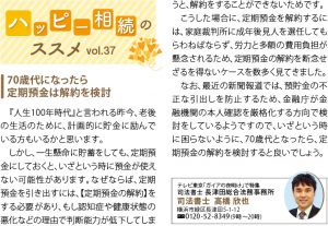 | 『人生100年時代』と言われる昨今、老後の生活のために、計画的に貯金に励んでいる方もいるかと思います。 しかし、一生懸命に貯蓄をしても、定期預金にしておくと、いざという時に預金が使えない可能性があります。なぜならば、定期預金を引き出すには【定期預金の解約】をする必要があり、もし認知症や健康状態の悪化などの理由で判断能力が低下してしまうと、解約ができないためです。 こうした場合に定期預金を解約するには、家庭裁判所に成年後見人を選任してもらわねばならず、労力と多額の費用負担が懸念されるため、定期預金の解約を断念せざるを得ないケースを数多く見てきました。 なお、最近の新聞報道では、預貯金の不正な引出しを防止するため、金融庁が金融機関の本人確認を厳格化する方向で検討をしているようですので、いざという時に困らないよう、70歳代となったら、定期預金の解約を検討するとよいでしょう。 |