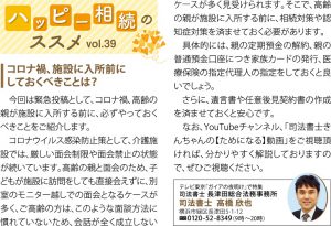 | 今回は緊急投稿として、コロナ禍、高齢の親が施設に入所する前に、必ずやっておくべきことをご紹介します。 コロナウィルス感染防止対策として、介護施設では、厳しい面会制限や面会禁止の状態が続いています。恒例の親と面会のため、子どもが施設に訪問しても直接会えずに、別室のモニター越しでの面会となることが多く、ご高齢の方はこのような面談方法に慣れていないため、会話が全く成立しないケースが多く見受けられます。そこで、高齢の親が施設に入所する前に、相続対策や認知症対策を済ませておく必要があります。 具体的には、親の定期預金の解約、親の普通預金口座につき家族カードの発行、医療保険の指定代理人の指定をしておくとよいでしょう。 さらに、遺言書や任意後見契約書の作成を済ませておくと安心です。 |