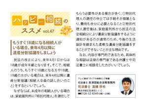| 民法の改正により、来年4月1日からは18歳が成年年齢となります。そこで、相続人のうち、もうすぐ18歳になる方や18歳、19歳の方がいる場合は、来年4月以降に遺産分割協議(相続人全員の話し合いのこと)をするといいでしょう。なぜならば、未成年の相続人がいる場合は、家庭裁判所に「特別代理人」を選任してもらう必要性がある場合が多く、①特別代理人の選任の申立ては手続きが煩雑となり、費用も余分に必要となること②特別代理人選任後は、家庭裁判所から民法の法定相続分により遺産分割協議をするように通知があるのが通常のため、今後の生活設計を踏まえた柔軟な遺産分割協議をすることができないことが主な理由です。 なお、内容が専門的であるため、具体的な相談は法律の専門家である弁護士や司法書士に相談をしたほうがいいでしょう。 |