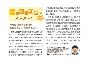 | 土地の測量や建物の修繕等の為に、隣地に立ち入る必要があるが、隣地所有者が不明であったり、住所が不明であるため、承諾が得られず困っているという相談を受けることがあります。 このような場合、現在の民法では、『隣地の使用を請求することができる』と定められており、隣地所有者の承諾を得ることが必要でした。 そうすると、隣地所有者が誰であるか不明だったり、住所が不明の場合は、隣地所有者を調査するのに相当な時間と労力が必要となり、問題がありました。 そこで、令和5年4月1日からは、『隣地を使用することができる』として『請求』という文言が削除され、土地所有者等は、民法209条1項に該当する場合には、隣地所有者の承諾がなくても、隣地を使用することができるようになりました。 なお、隣地を使用する際には、使用の日時、場所および方法について、隣地所有者等にとって、最も損害が少ないようにしなければならないと定められていますのでご注意下さい。 |