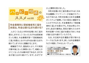 | 人が亡くなると、市町村役場に死亡届を提出しますが、亡くなった方が年金受給者だった場合、年金事務所等へ『受給権者死亡届』を提出しなければ年金は振り込まれ続けてしまうのかと疑義が生じます。 経験談ですが、孤独死により、その発見が数年後となった事例において、相続人から「亡くなったのは数年前であるが、発見が遅れたので、まだ年金が振り込まれ続けています。なぜですか」と質問を受けました。市町村役場に死亡届を提出すれば、日本年金機構にマイナンバーが収録されている方であれば、市町村役場と日本年金機構がシステムで連携しており相互に確認することができるため、年金事務所に『受給権者死亡届』が未提出でも、年金は停止されます。前述の事例は、発見が遅れたため市町村役場への死亡届が未提出であり、年金が振り込まれ続けていたのです。なお、未支給年金を遺族が受け取れるケースなどもあります。詳しくは年金事務所などに相談してみるとよいでしょう。 |