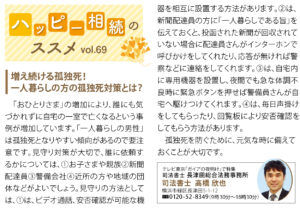 | 「おひとり様」の増加により、誰にも気づかれずに自宅の一室で亡くなるという事例が増加しています。孤独死には傾向があり、「一人暮らしの男性」は孤独死となりやすいので要注意です。 誰に見守りを依頼するかについては、❶お子様や親族、❷新聞配達員、❸警備会社、❹近所の方や地域の団体等に依頼してみるとよいでしょう。 見守りの方法を説明しますと、❶は、ビデオ通話、安否確認が可能な機器を、相互に設置する方法があります。❷は、新聞配達員の方に「一人暮らしである旨」を伝えておくと、投函された新聞が回収されていない場合に、配達員さんがインターホンで呼びかけをしてくれたり、応答が無ければ警察などに連絡をしてくれます。❸は、自宅内に専用機器を設置し、夜間でも急な体調不良時に緊急ボタンを押せば、警備員さんが自宅へ駆けつけてくれます。❹は、毎日声掛けをしてもらったり、回覧板により安否確認をしてもらう方法があります。 孤独死を防ぐために、元気な時に備えておくことが大切です。 |