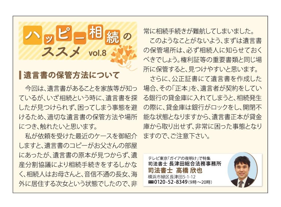 今回は、遺言書があることを家族等が知っているが、いざ相続というときに、遺言書を探したが見つけられず、困ってしまう事態を避けるため、適切な遺言書の保管方法や場所につき、触れたいと思います。私が依頼を請けた最近のケースを御紹介しますと、遺言書のコピーがお父さんの部屋にあったが、遺言書の原本が見つからず、遺産分割協議により相続手続きをするしかなく、相続人はお母さんと、音信不通の長女、海外に居住する次女という状態でしたので、非常に相続手続きが難航してしまいました。