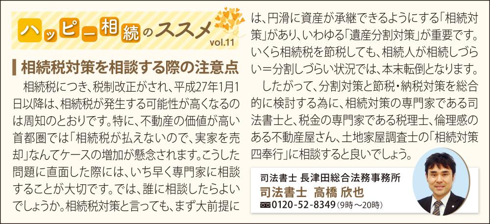 相続税につき、税制改正がされ、平成27年1月1日以降は、相続税が発生する可能性が高くなるのは周知のとおりです。特に、不動産の価値が高い首都圏では「相続税が払えないので、実家を売却」なんてケースの増加が懸念されます。こうした問題に直面した際には、いち早く専門家に相談することが大切です。では、誰に相談したらよいでしょうか。相続税対策と言っても、まず大前提には円滑に資産を継承できるようにする「相続対策」があり、いわゆる「遺産分割対策」が重要です。いくら相続税を節税しても、相続人が相続しづらい=分割しづらい状況では、本末転倒となります。したがって、分割対策と節税・納税対策を総合的に検討する為に、相続対策の専門家である司法書士と、税金の専門家である税理士、倫理観のある不動産屋さん、土地家屋調査士の「相続対策四奉行」に相談するとよいでしょう。