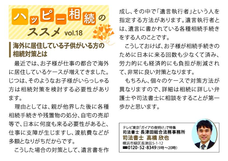 | 国際化が進み、子供が海外で暮らしているケースが増加の一途です。実は、このようなケースでは遺言書の作成が必須です。 理由としては、親が他界した後に、不動産や預貯金などの相続手続きや遺品の整理や処分、自宅の売却等で、何度も来日をする必要性が生じるため、仕事に支障が生じたり、渡航費が多額となってしまうからです。 具体的には、遺言書にて「遺言執行者」を指定する方法があります。 遺言執行者とは、遺言書に記載されている全ての相続手続きをする人のことです。 遺言執行者を定めておけば、子供が相続手続きのために、日本に来る回数を抑えることができ、労力的にも、経済的にも負担が削減されます。 なお、個々の状況により、対策方法が異なりますので、まずは相続に詳しい司法書士等に、相談をすることが、対策の第一歩かと思います。 |