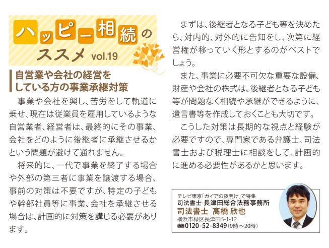 また、事業に必要不可欠な重要な設備、財産や会社の株式は、後継者となる子ども等が問題なく相続や承継ができるように、遺言書等を作成しておくことも大切です。こうした対策は長期的な視点と経験が必要ですので、専門家である弁護士、司法書士および税理士に相談をして、計画的に進める必要があるかと思います。